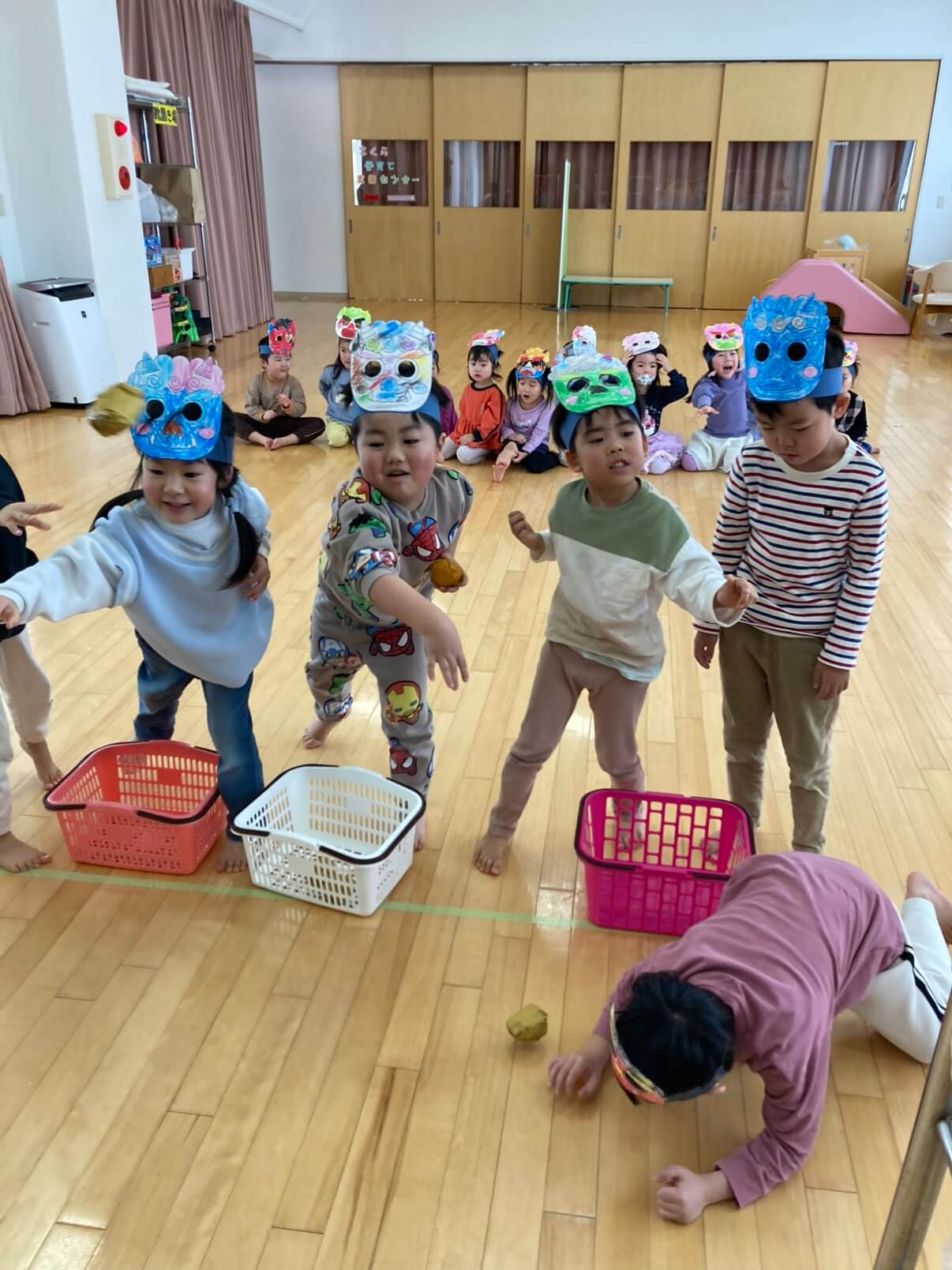 今日はみんなで節分の由来のお話をきいたり、手づくりの豆で元気にまめまきをしました。