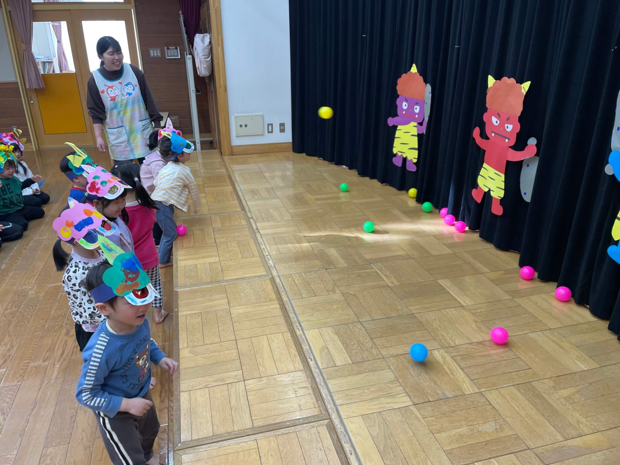 節分の集会を行いました 2026 2/04 むつみ保育園 2026年2月4日 保育士が手作りの節分の紙芝居を見ました。子ども達は自分の中にいる鬼をやっつけて追い出すために、たくさんのボールを思いっきり投げていました。自分の中の鬼を退治で来たかな? むつみ保育園