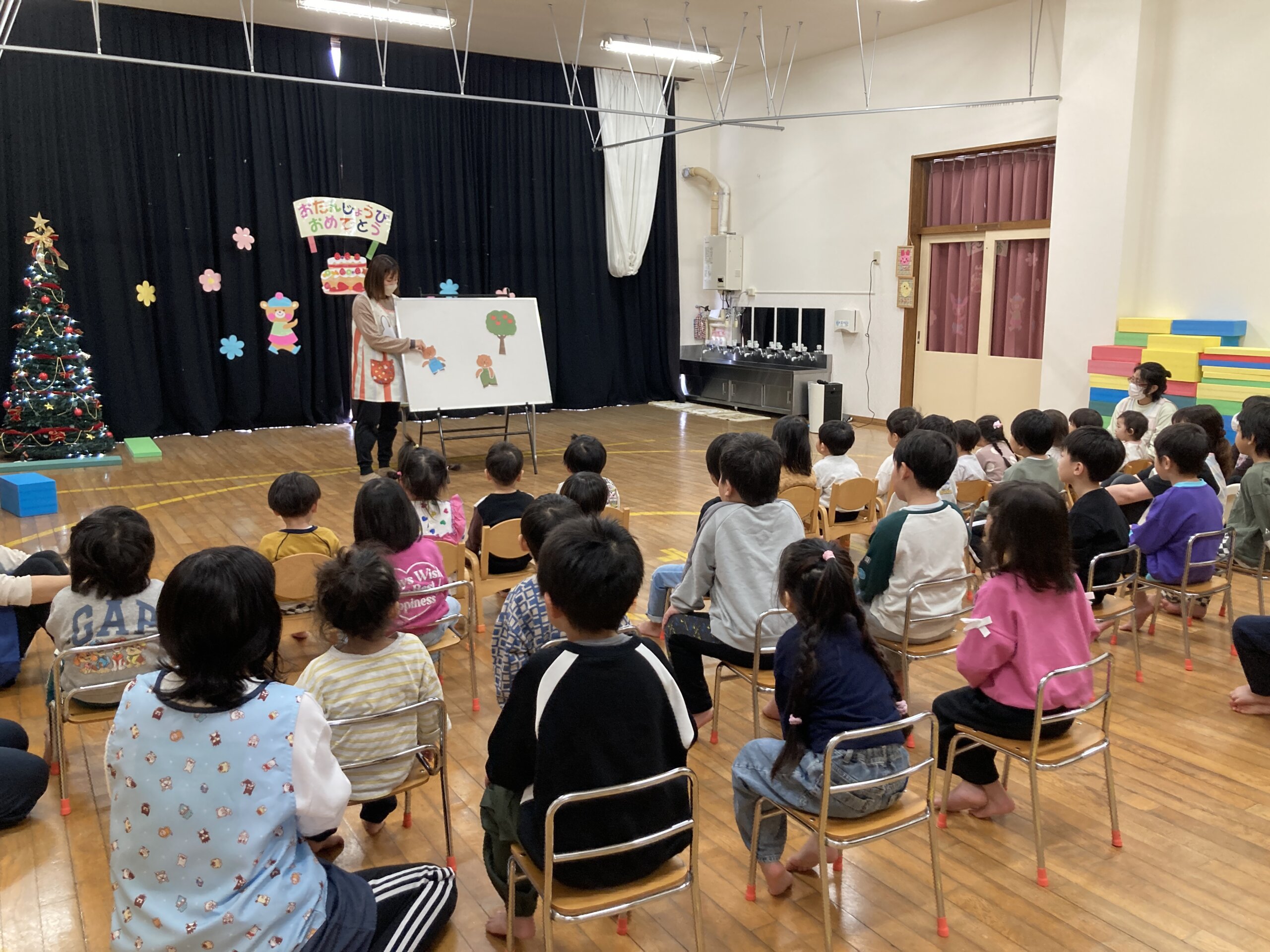 11月のお誕生会 2025 11/27 すみれ保育園 2025年11月27日 11月生まれのお誕生会。 1名のお友だちがお祝いされました。 職員発表は「パネルシアター」。場面の中でみんなで声を出す所があったのですが 大きいクラスのお友だちは恥ずかしがりながら声を出していました~。 すみれ保育園