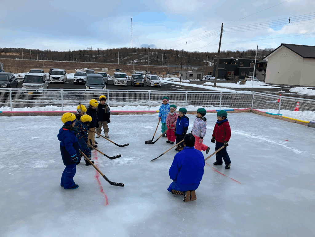 学童専用の園庭があり、冬は長ぐつアイスホッケーやスケートを体験します。
